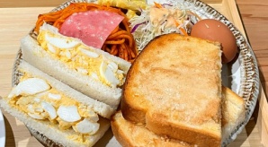 ボリューム満点のタマゴサンドとアーモンドトーストのモーニングに
