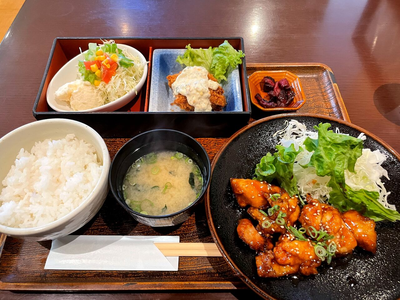 2025年12月23日 姫路 日替りランチ♪《樹里亜》 先日、お昼ごはんを食べに行きました。お店は 姫路市の 『 樹里亜 』です。広畑区正門通にあるカフェレストランです♪気になっていたのでランチに訪問してみました(^^)入口を入ると美味しそうなディスプレイ♪店内はこんな感じ分煙されてるので禁煙席に座りました♪メニューはこちらモーニングのメニューも豊富です♪そして注文したのはこちら本日の日替り(900円)♪鶏の照焼♪柔らかくて美味しいです(^^♪カキフライ♪小ぶりですが揚げたてでタルタルソースでいただくと美味しいです(^^♪サラダ♪ごはん♪ みそ汁♪美味しい鶏の照焼とカキフライにお腹いっぱい大満足でした♪またランチやモーニングを食べに再訪したいと思います(^.^)樹里亜姫路市広畑区正門通2-10-17079-239-5906モーニング 7:00 ~ 11:00ランチ 11:30 ~ 14:00駐車場 あり 樹里亜 関連ランキング:喫茶店 | 広畑駅、夢前川駅