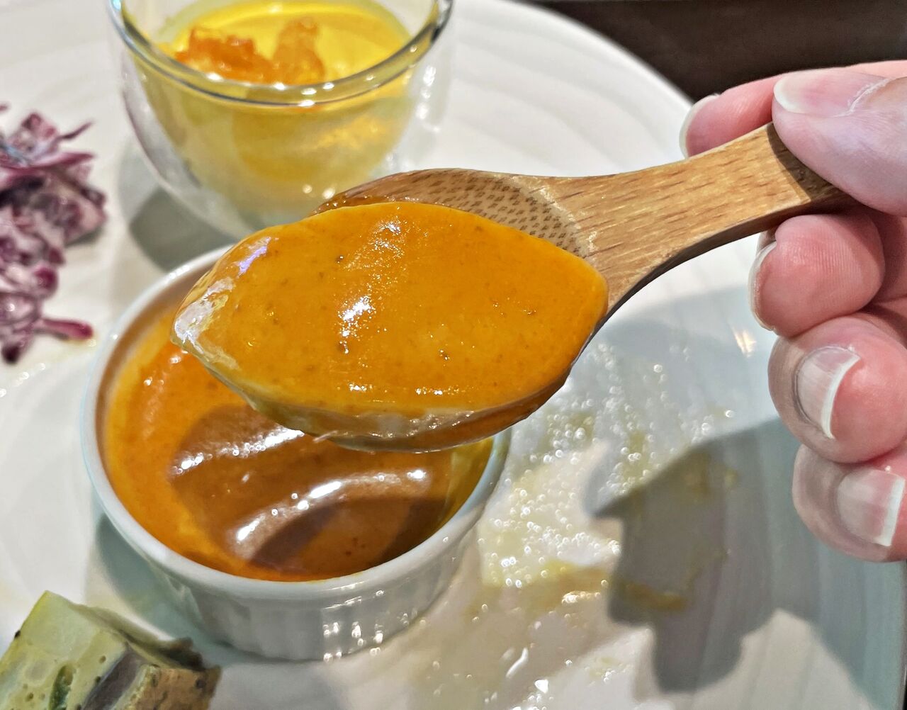 赤ワインソースと緑の万願寺ソースの2種類のソースがかかってます(^^)