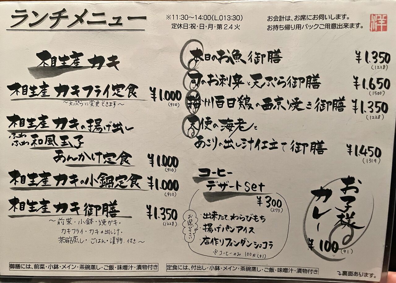 今はカキの季節なのでカキのメニューから