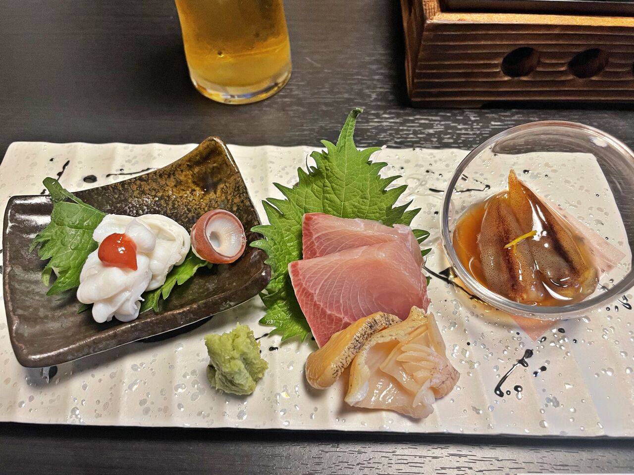 ホタルイカの沖漬け♪ ブリ♪ 赤貝♪ 水だこの梅肉添え♪このお刺身はほんとどれも美味しかったです♪