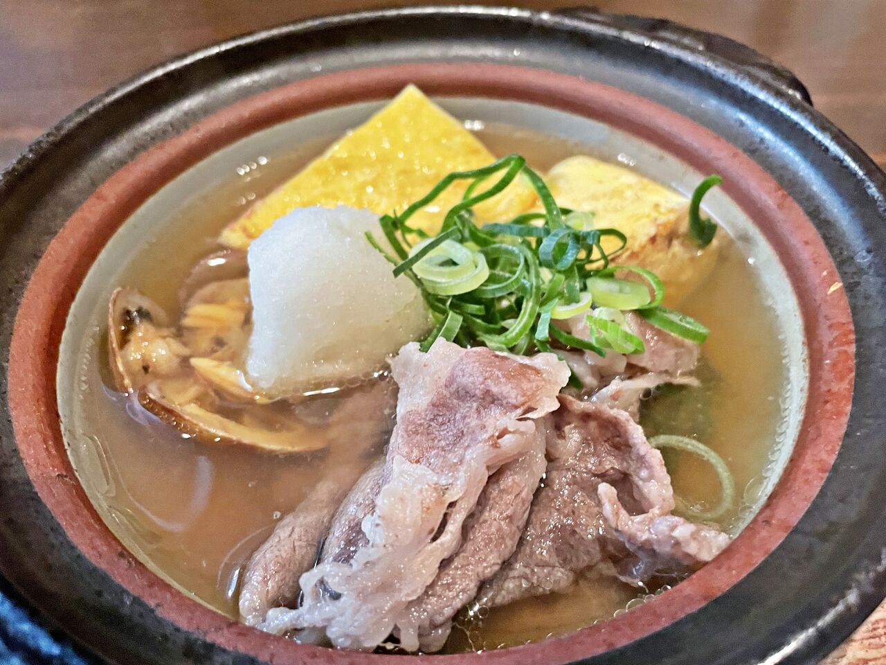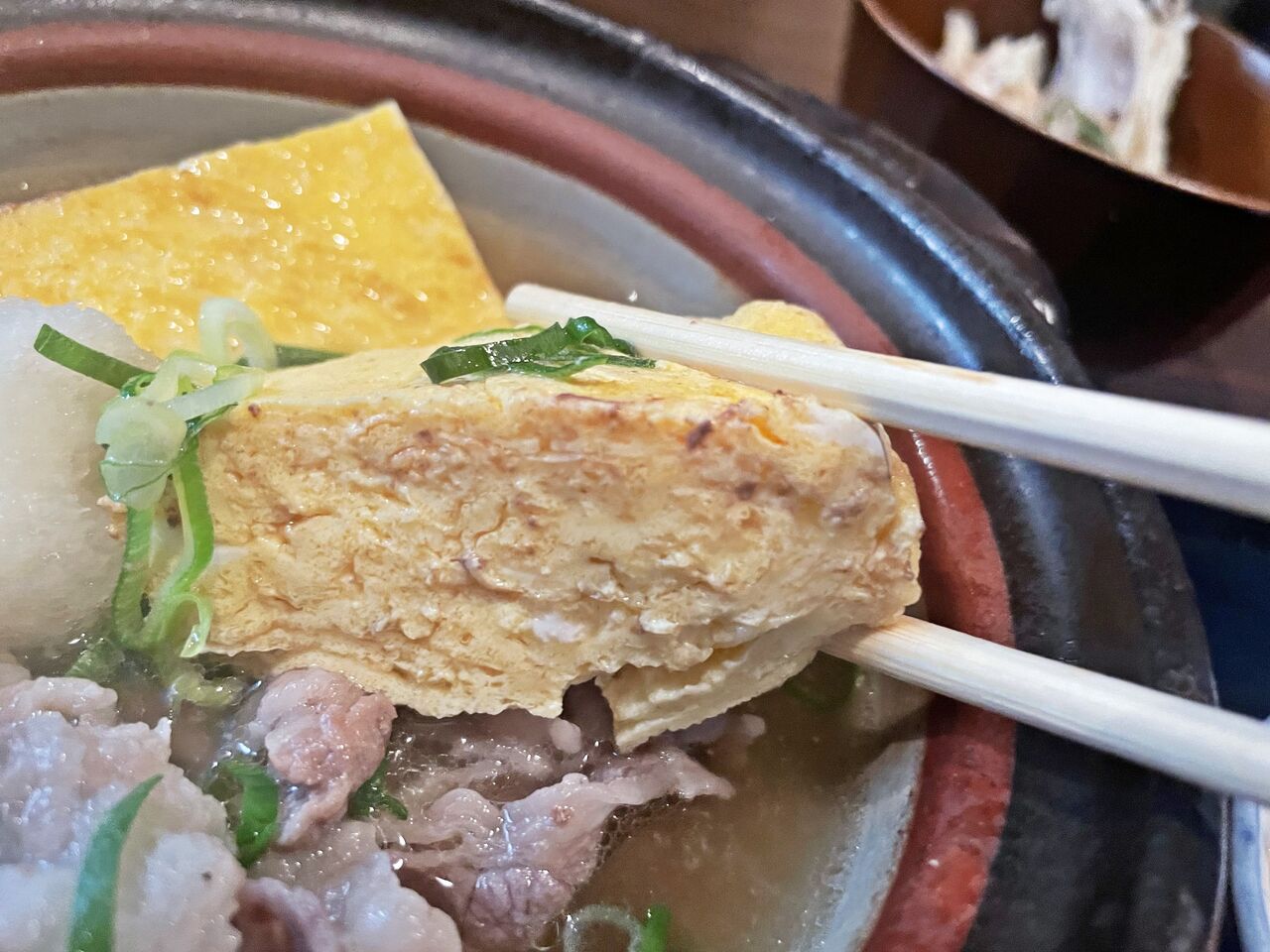 土鍋の出し汁の中に黒毛和牛と出し巻き玉子が入ってます♪