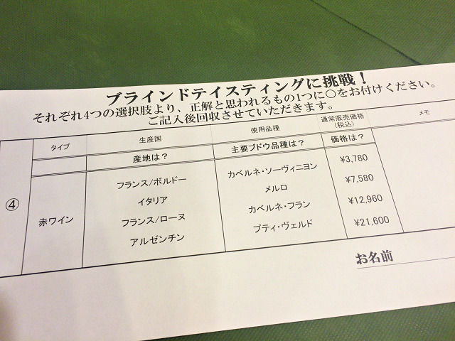 ブラインドテイスティングで産地、ブドウ品種、価格を当てるというゲームです(^^)