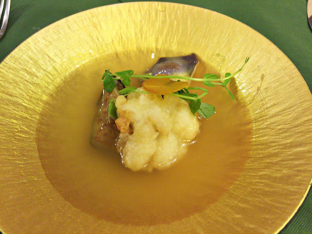 鱧と淡路焼き茄子の冷たいスープ カラスミのアクセント♪