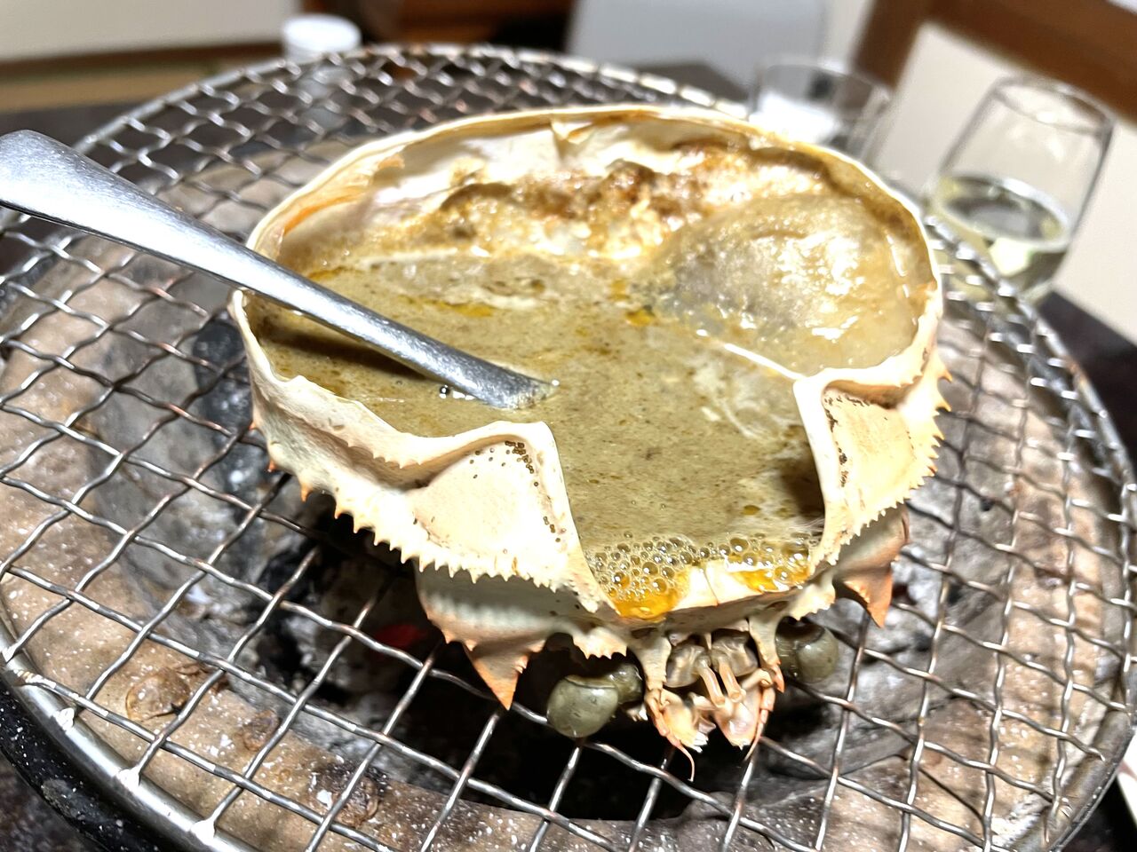 カニ味噌は炭火で焼いて