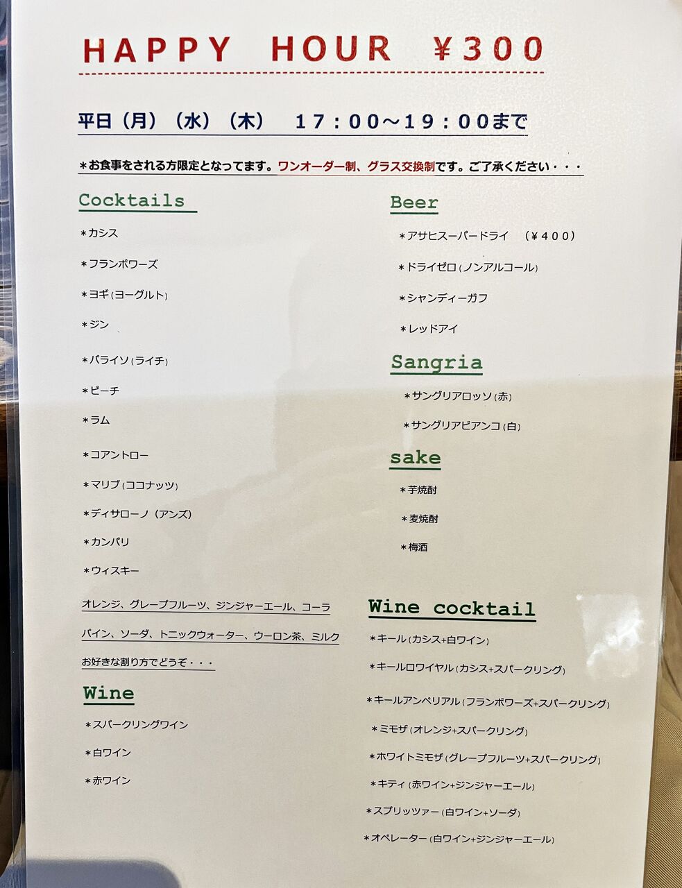 平日(月)(水)(木)の17時~19時はハッピーアワーで