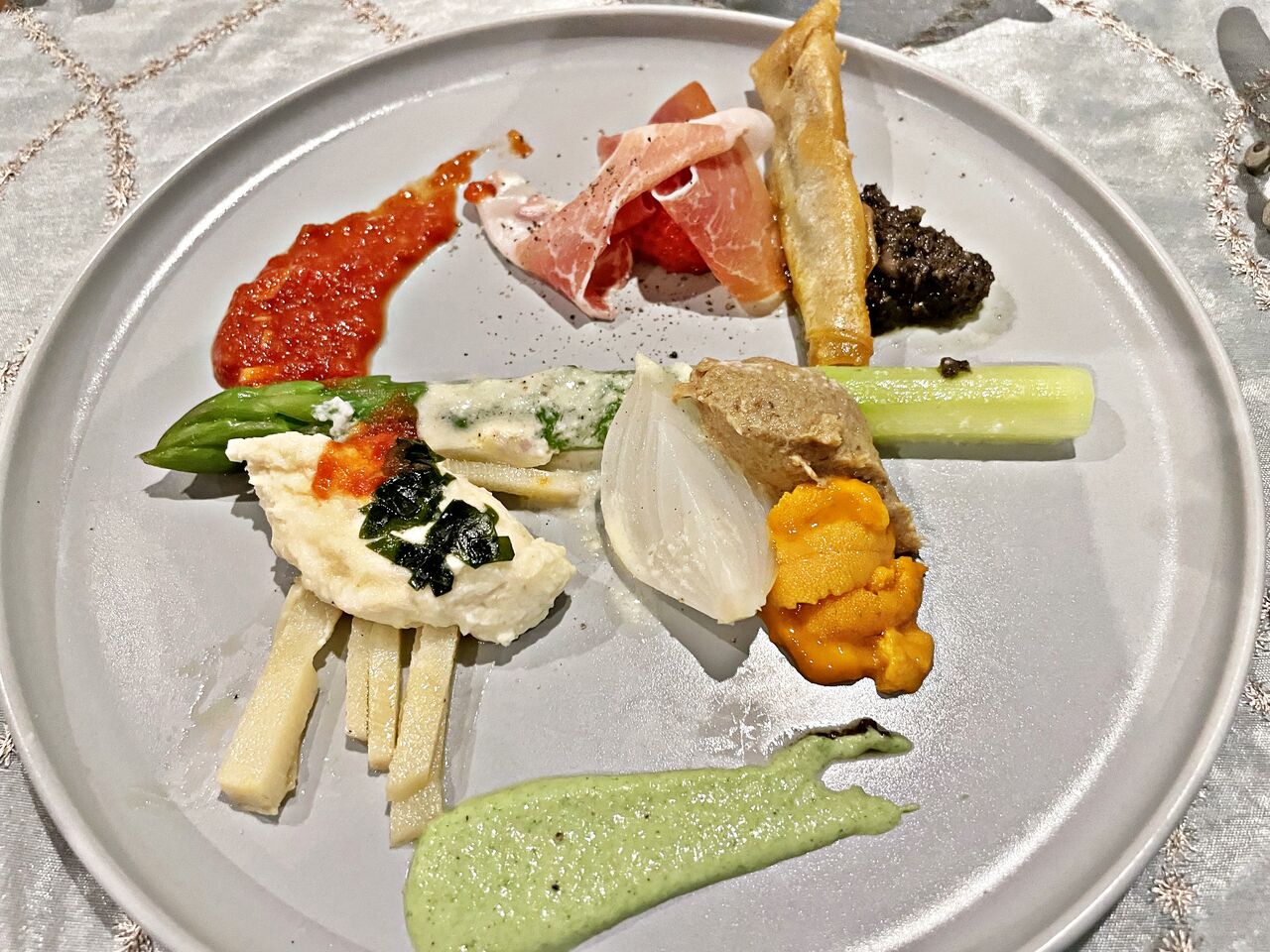 オードブル盛り合わせ♪筍のムース♪ 鯵とたまねぎのリエット♪ 蒸あな♪ 雲丹♪など