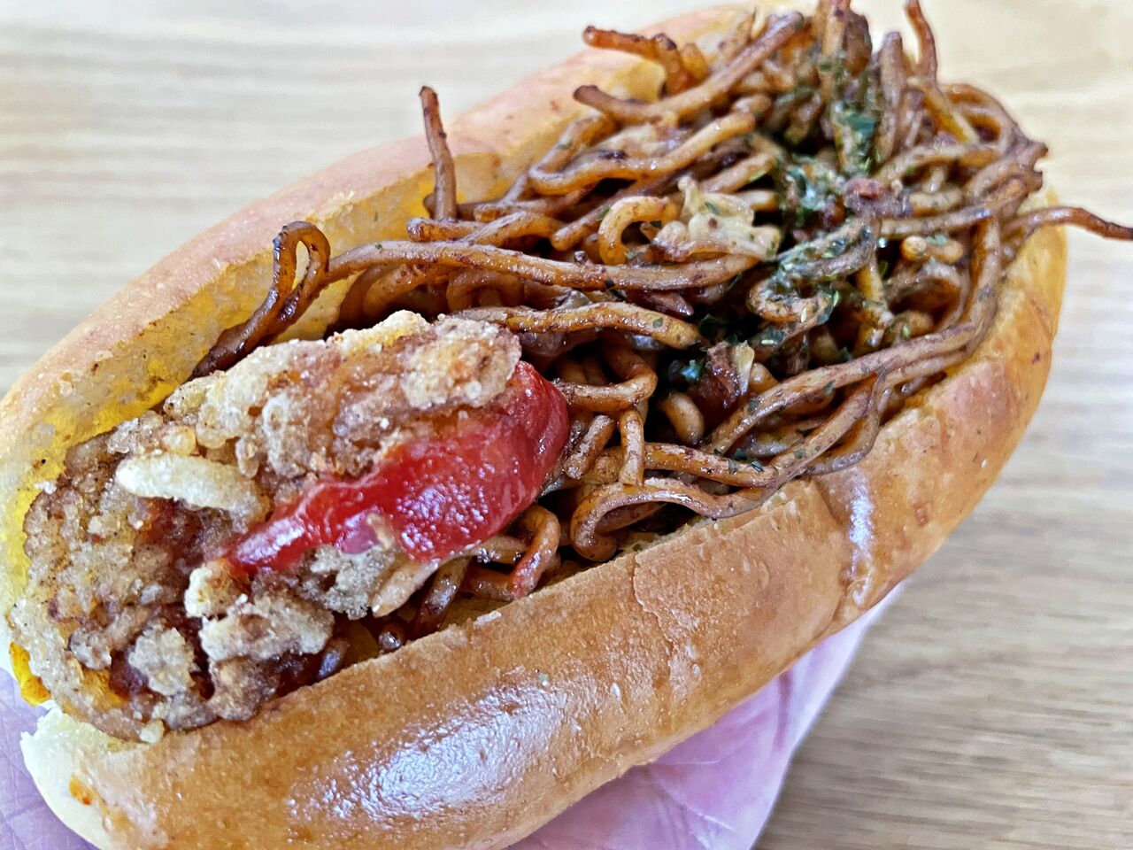焼きそばもたっぷり挟んでありますが、唐揚げも乗ってるので食べ応えありの