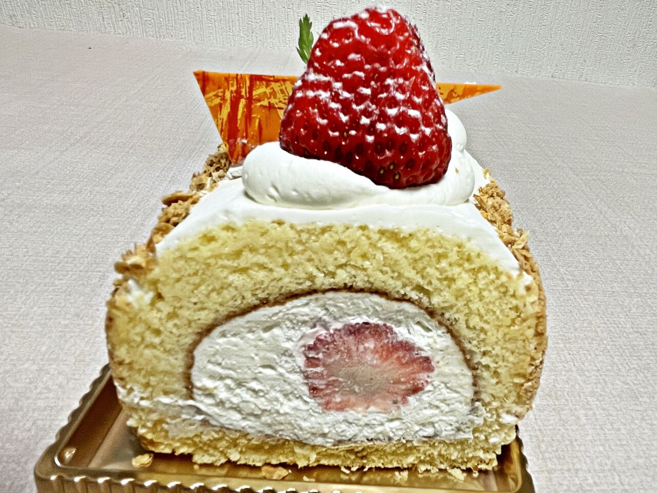 苺の乗ったクリームたっぷりのロールケーキです(^^)