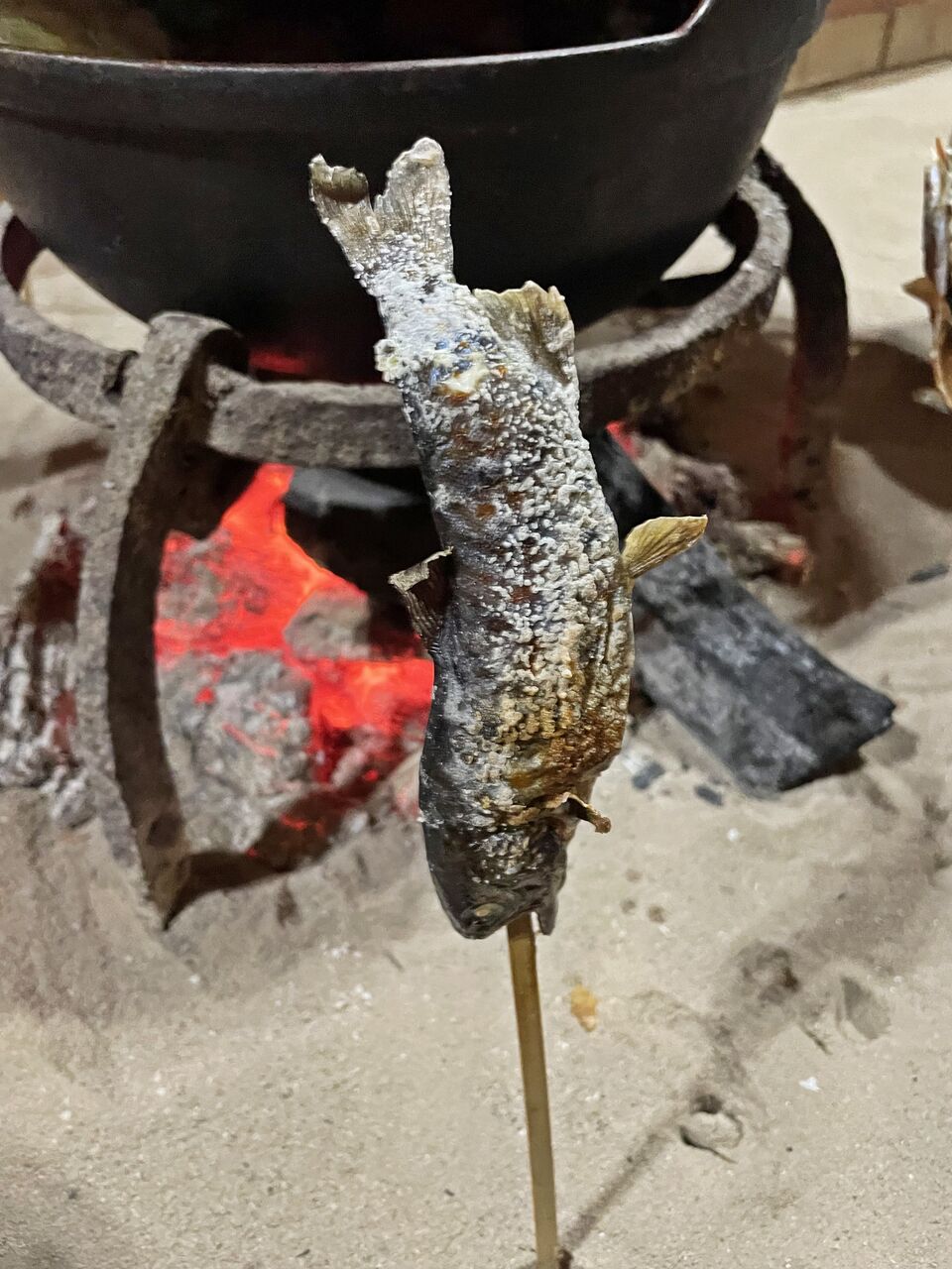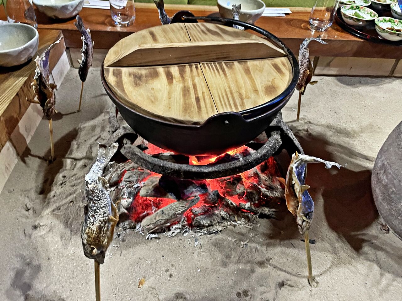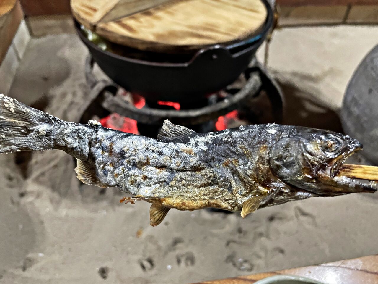 囲炉裏の鍋の周りにはアマゴの炭焼き♪