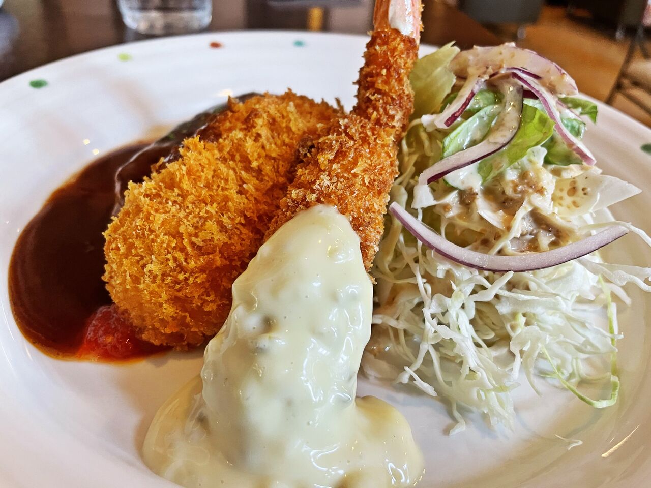 海老フライはたっぷりタルタルソースをつけていただきます♪