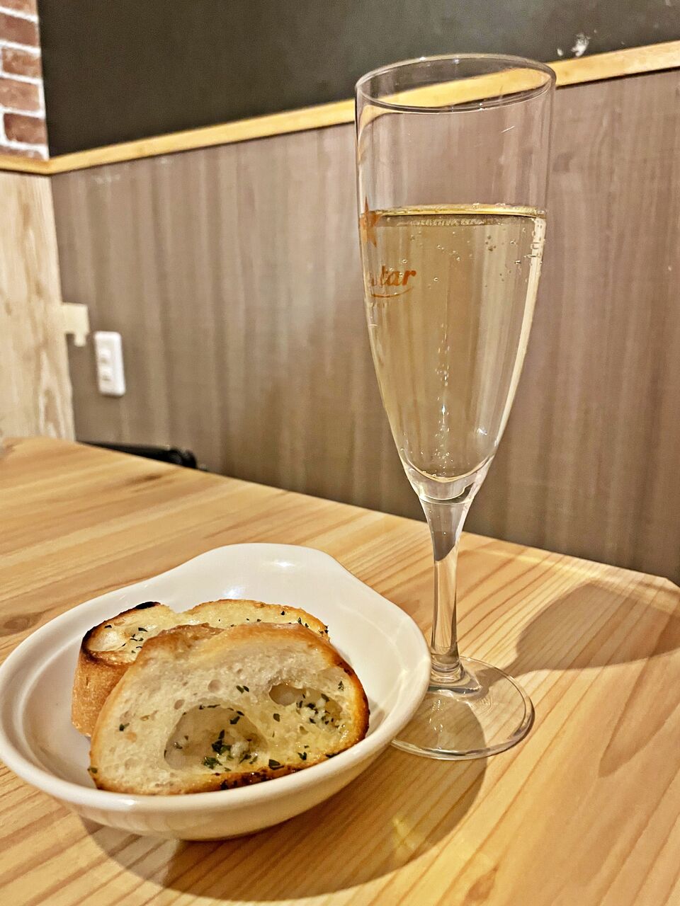 スパークリングワイン♪ お通しのガーリックトースト♪