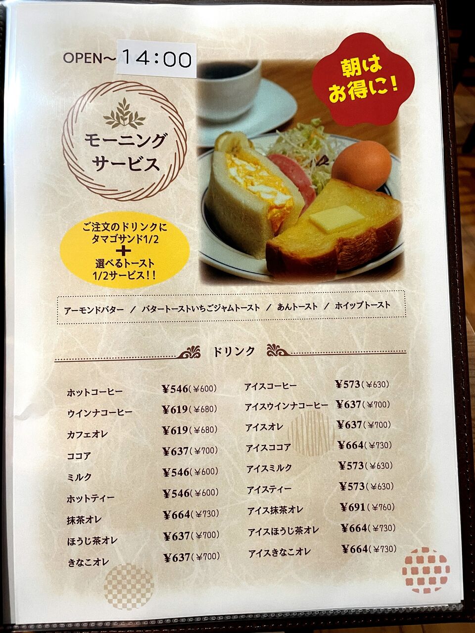 お得なドリンク代のみのモーニング♪