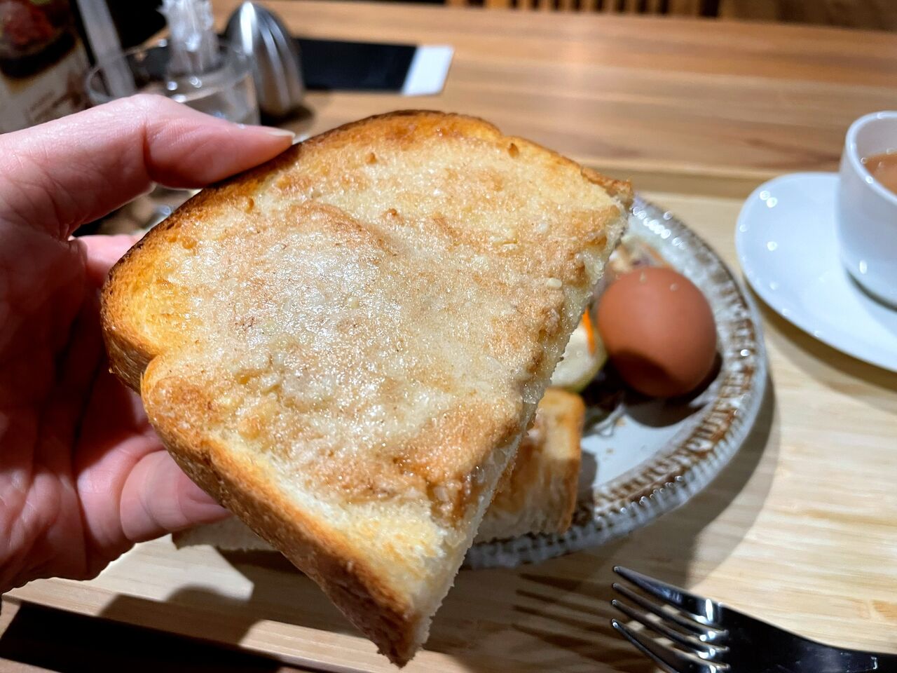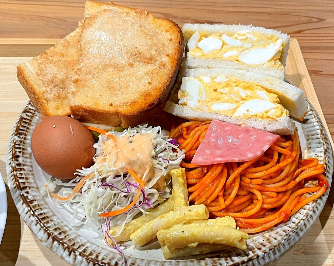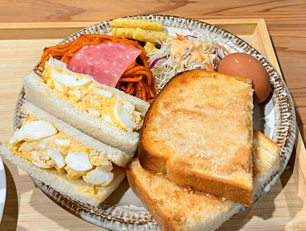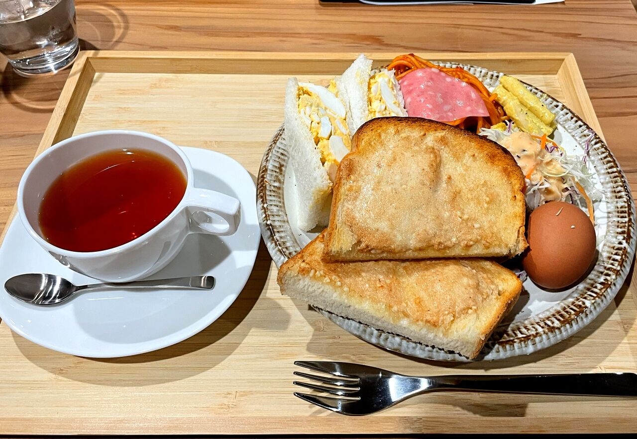 ボリューム満点のタマゴサンドとアーモンドトーストのモーニングに