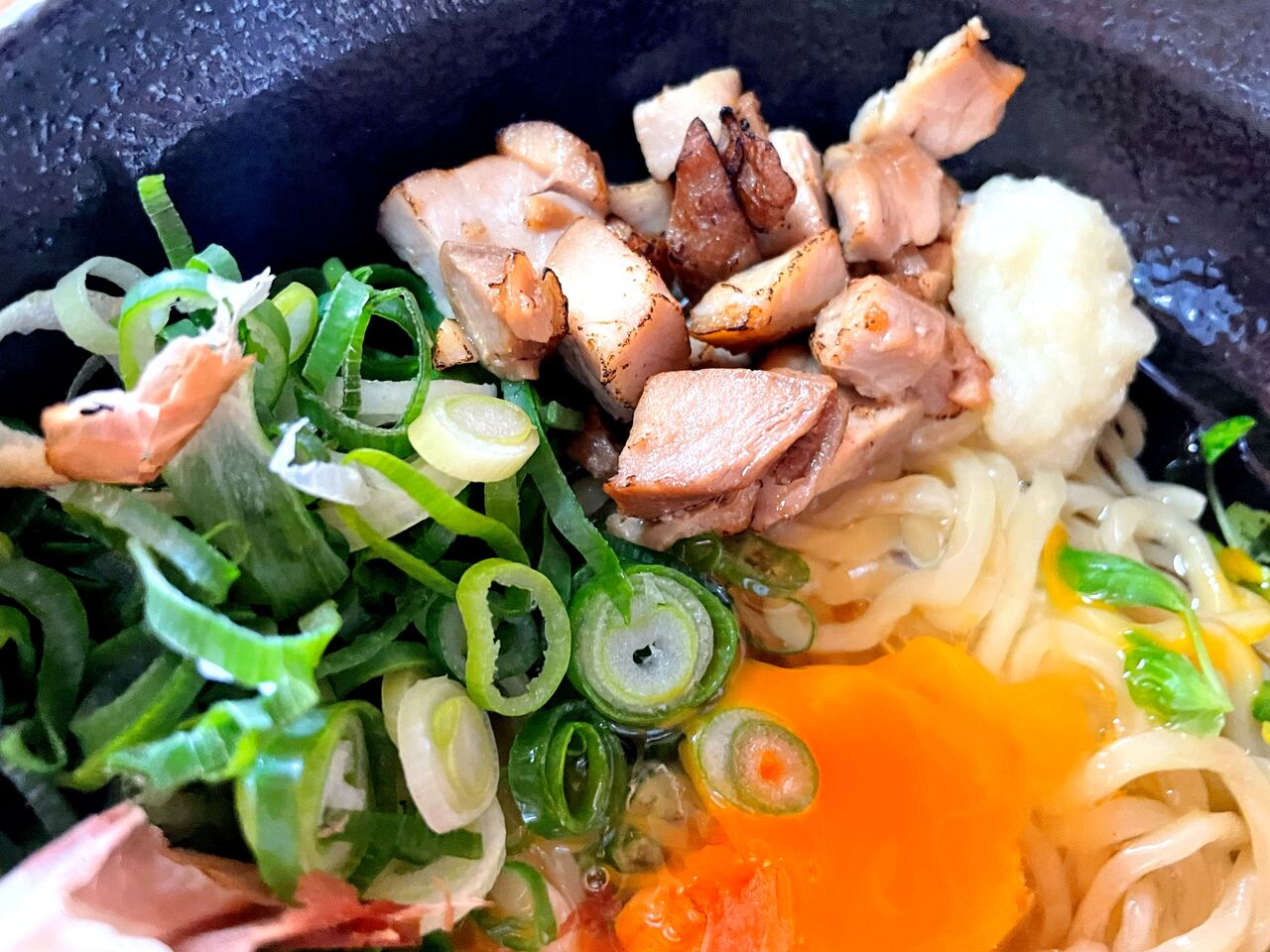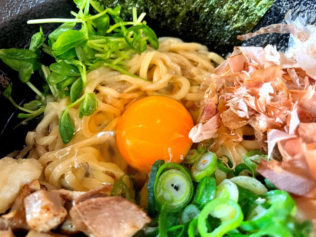 ネギたっぷりにチャーシュー、生卵、にんにくがトッピングされています(^^)