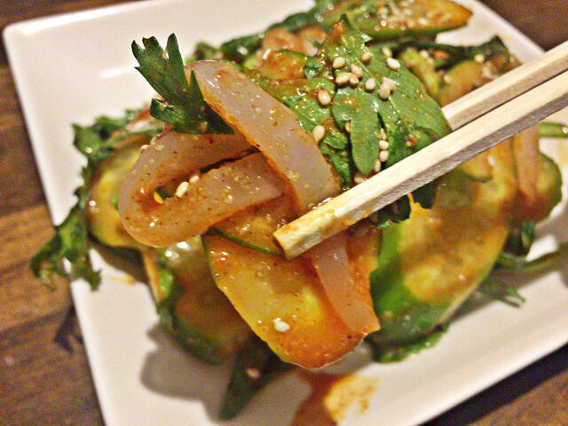新鮮なイカにピリ辛のタレと野菜をからめて食べると美味しい(^^♪