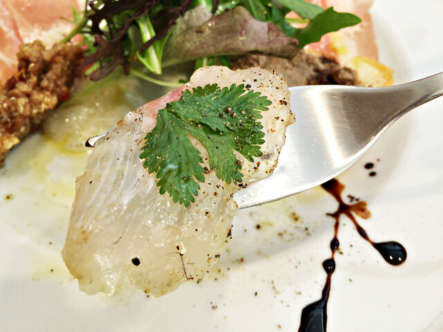 鯛のマリネは鯛のスープで作ったジュレとパクチーがいい感じで美味しい(^^♪