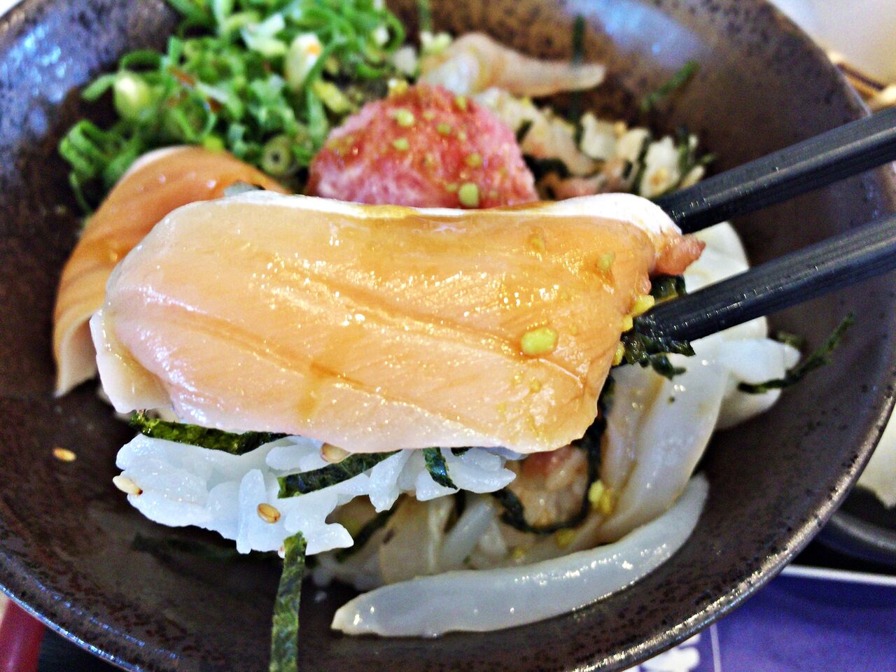 サーモン、イカ、エビなどが乗っていて美味しい(^^♪