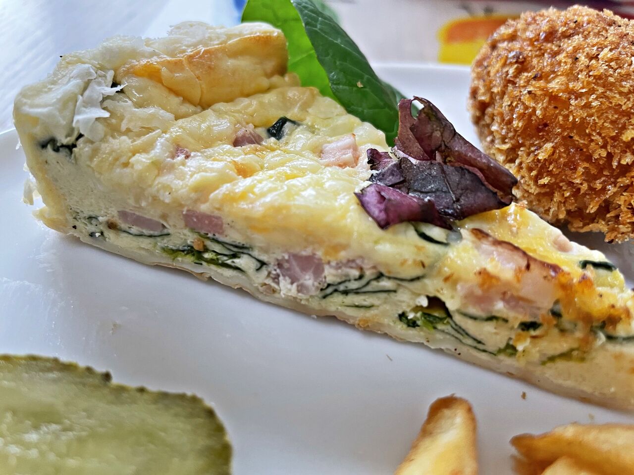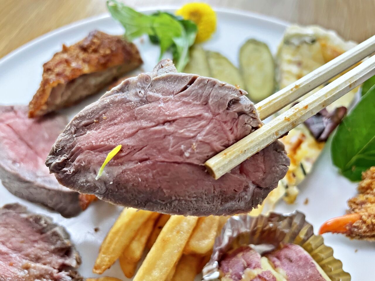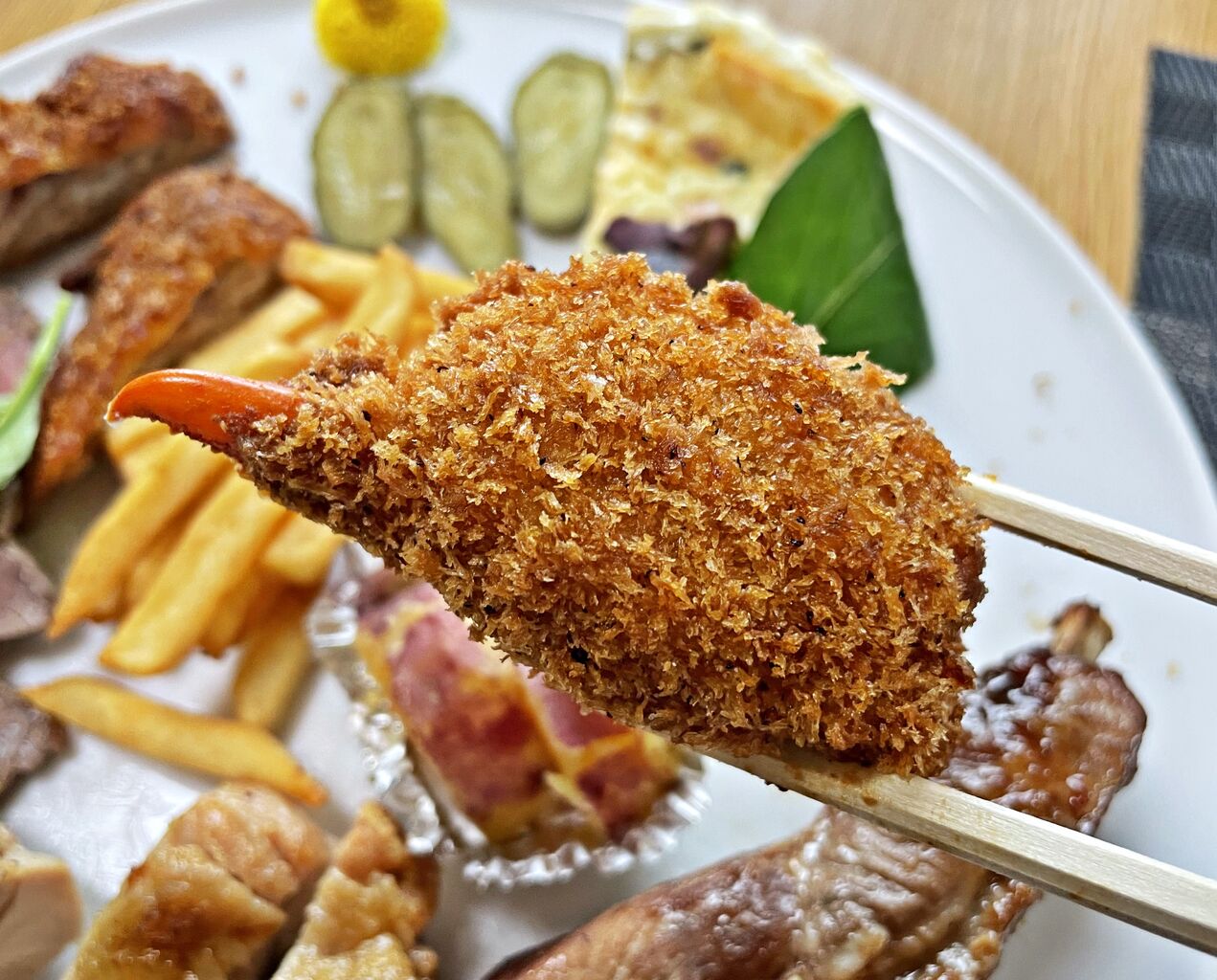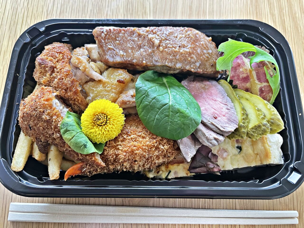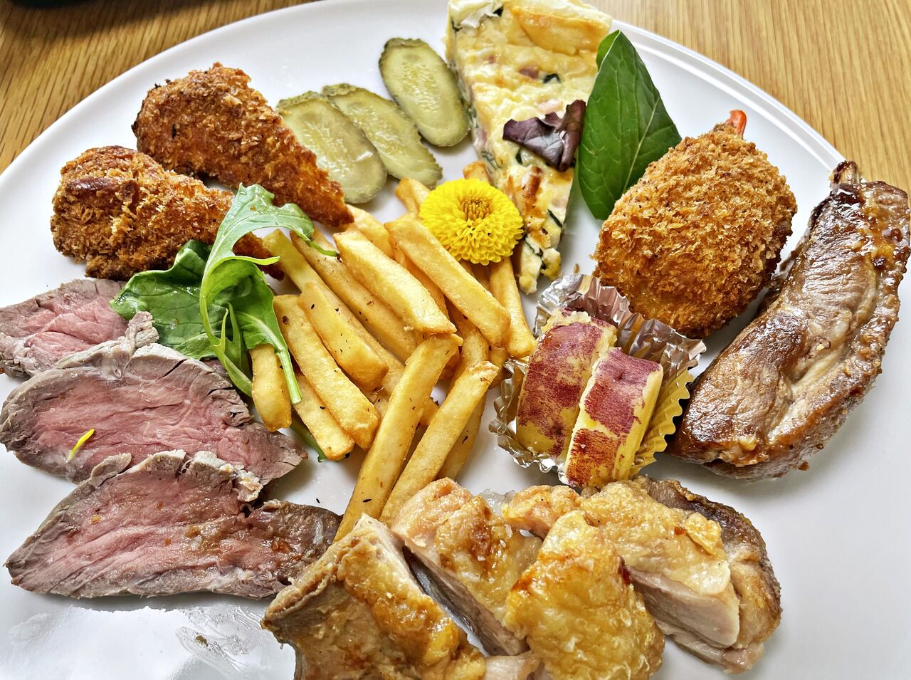 キッシュ、魚フライ、ピクルス、ローストビーフ、カニクリームコロッケ